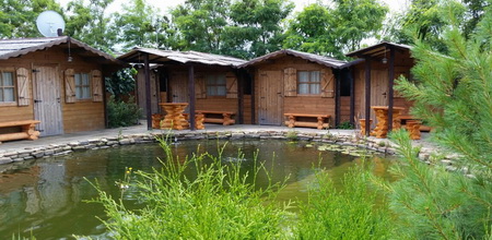 Выберите подходящий тип размещения: один из пяти небольших отдельных домиков, расположенных вокруг пруда, или для большой компании – двухэтажный коттедж-шале.